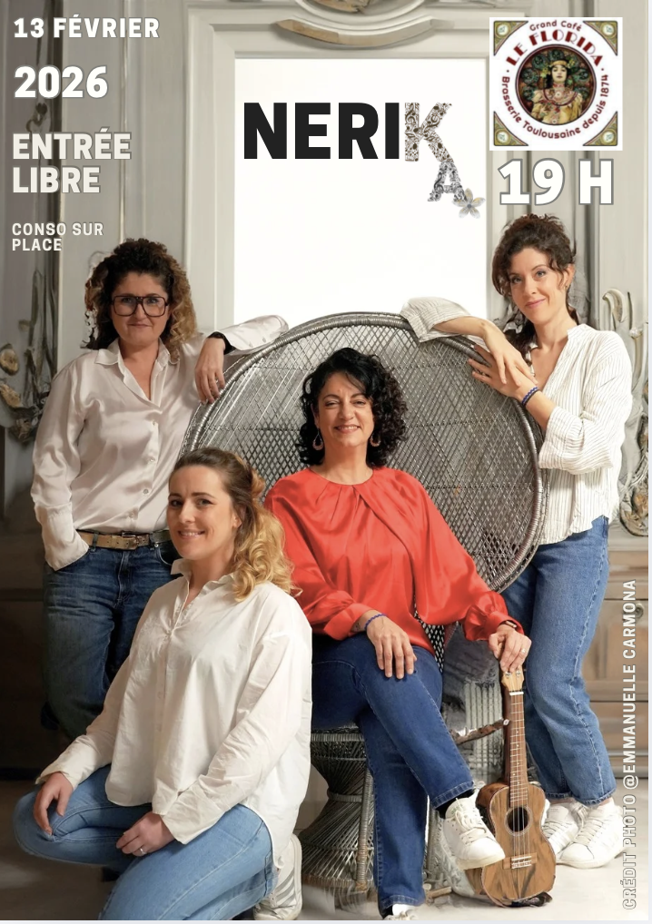 Nérika vous fera découvrir son univers musical qui vous fera voyager vers des métissages surprenants, toujours valorisé par la présence des voix, et du chant. Vous découvrirez ainsi les choristes de Nerika : Elise Huet, Julie Sorli et Noémie Maillols. Ces compositions de chansons françaises sont interprétées par des musiciens exceptionnels : Bertrand Allaume à la basse, Jérôme Roubeau à la batterie, Nicolas Dri aux claviers (piano et orgue Hammond). Stéphanie Berti à la guitare.